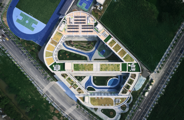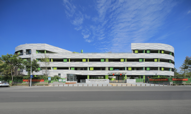 河西新城四小位于南京市建鄴區(qū)江山大街以北、黃山路以東,建筑面積2.79萬(wàn)平方米,教學(xué)樓主體4層,局部3層,地下1層,建筑高度16.95米,可容納教職工和學(xué)生1705人。建筑整體采用扁平化“曰”字形結(jié)構(gòu),包含傳道授業(yè)的教學(xué)理念,造型可演化為鉛筆、書(shū)籍、綠葉,寓意在學(xué)習(xí)中獲得知識(shí)、不斷成長(zhǎng)。