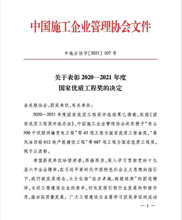 2021年12月6日,中國(guó)施工企業(yè)管理協(xié)會(huì)公布2020-2021國(guó)家優(yōu)質(zhì)工程獎(jiǎng)獲獎(jiǎng)名單,河西集團(tuán)新城公司所屬南京河西工程項(xiàng)目管理有限公司代建的招商銀行南京分行招銀大廈項(xiàng)目喜獲該獎(jiǎng)項(xiàng)。國(guó)家優(yōu)質(zhì)工程獎(jiǎng)設(shè)立于1981年,是經(jīng)國(guó)務(wù)院確認(rèn)的我國(guó)工程建設(shè)領(lǐng)域設(shè)立最早,規(guī)格最高,跨行業(yè)、跨專(zhuān)業(yè)的國(guó)家級(jí)質(zhì)量獎(jiǎng)。