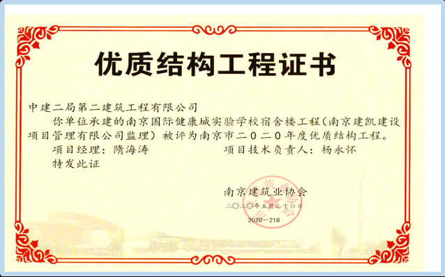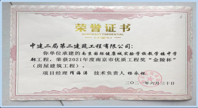 2021年12月6日,中國施工企業(yè)管理協(xié)會公布2020-2021國家優(yōu)質(zhì)工程獎獲獎名單,河西集團(tuán)新城公司所屬南京河西工程項(xiàng)目管理有限公司代建的南京國際健康城實(shí)驗(yàn)學(xué)校項(xiàng)目喜獲該獎項(xiàng)。國家優(yōu)質(zhì)工程獎設(shè)立于1981年,是經(jīng)國務(wù)院確認(rèn)的我國工程建設(shè)領(lǐng)域設(shè)立最早,規(guī)格最高,跨行業(yè)、跨專業(yè)的國家級質(zhì)量獎。
