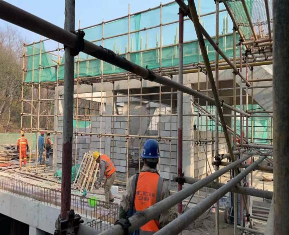 在紫金山莊配套設(shè)施擴(kuò)改建項目現(xiàn)場,聽到的是機(jī)器轟鳴、車輛喧囂的聲音,看到的是工作忙碌、干勁十足的景象,工人們正加緊二次結(jié)構(gòu)的施工。