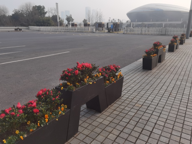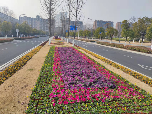 江蘇大劇院水韻路中分帶的花球也換上了“新裝”。10個巨大的羽衣甘藍花球被粉色的報春花和紅黃顏色角堇組成的花帶簇擁著,與兩邊的直線橙色花邊、方形花卉矩陣、流線型花帶一起構(gòu)成了一幅色彩斑斕、氣勢恢宏的絢麗畫卷,不但為兩會烘托出莊嚴隆重的氛圍,也洋溢著春節(jié)喜慶的氣氛。