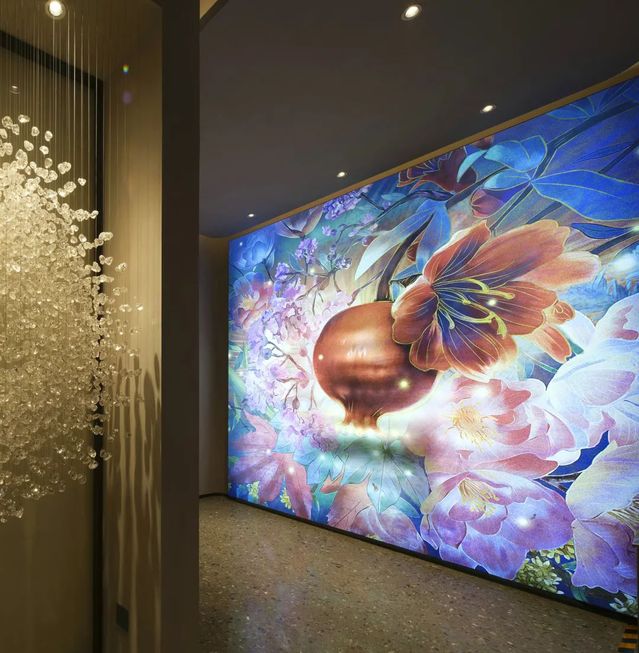 “人間歡喜事,石榴成熟時(shí)”,藝術(shù)生活館中一幅瑰麗絢爛的手繪花神圖渲染出主題氛圍,鮮花簇?fù)眍w粒飽滿石榴的畫(huà)幅,姹紫嫣紅中,將奧體公司開(kāi)發(fā)的奧體新城各小區(qū)名稱中的植物元素有機(jī)組合在一起,觀眾置身其中,仿佛能聞到花的芳香、看到石榴籽的晶瑩剔透。畫(huà)面寓意著花開(kāi)興隆、興旺昌盛,祝福幸福美好生活紅紅火火,也體現(xiàn)了河西集團(tuán)“開(kāi)發(fā)幸福、運(yùn)營(yíng)美好”的經(jīng)營(yíng)理念。整幅花神圖由特邀手繪師親繪而成,十分珍貴。