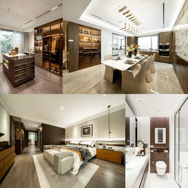 此次公開(kāi)的樣板間為265㎡奢華四房?jī)蓮d三衛(wèi)雙陽(yáng)臺(tái)戶型,在戶型研發(fā)和飾面材料使用上,設(shè)計(jì)團(tuán)隊(duì)都針對(duì)主要客戶人群的需求,經(jīng)過(guò)反復(fù)斟酌,對(duì)細(xì)節(jié)處理更是精益求精,成為奧體公司迭新之作。硬朗的石材紋理與沉穩(wěn)的木飾面碰撞出豐富的層次變化,加上墻面局部銅制捶打紋飾面和內(nèi)嵌式金屬開(kāi)關(guān)面板,營(yíng)造低調(diào)奢華的現(xiàn)代風(fēng)格。